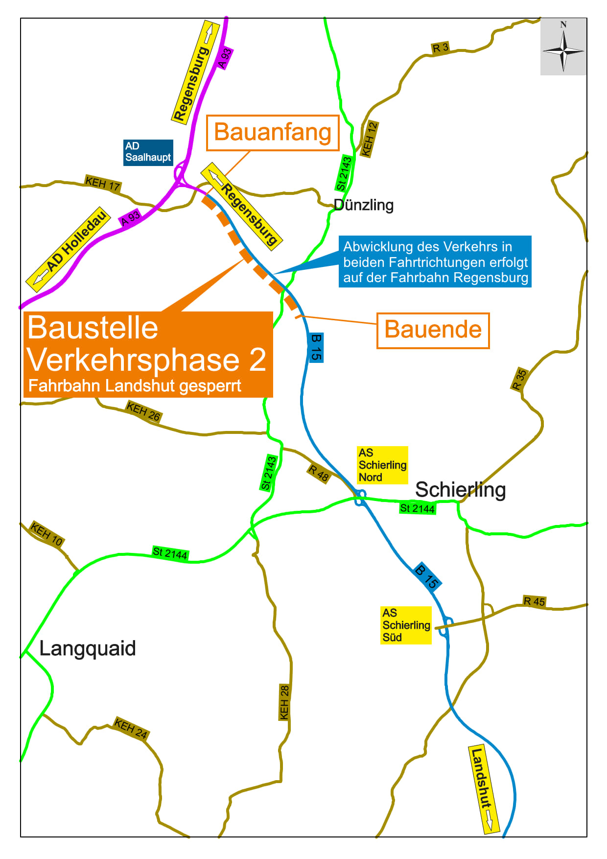 - Zweite Bauphase (ab Mitte Oktober, Sperrung Richtungsfahrbahn Landshut): Der Verkehr wird zwischen dem Autobahndreieck Saalhaupt und der Anschlussstelle Schierling Nord so geführt, dass in Fahrtrichtung Landshut ein Baufeld entsteht und der Verkehr auf der anderen verbleibenden Richtungsfahrbahn Regensburg in beide Richtungen fließen kann.