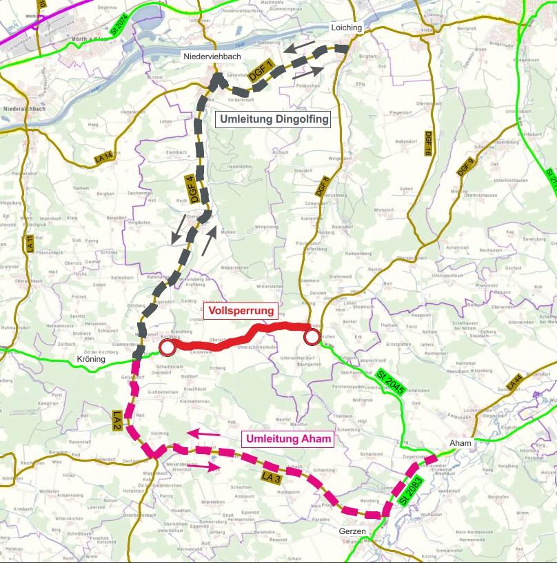 Die Umleitung aus Richtung Adlkofen in Richtung Aham erfolgt über die Kreisstraße DGF 4 (Richtung Niederviehbach), die DGF 1 (Richtung Loiching) und die DGF 16 nach Wendelskirchen. Die Umleitung aus Richtung Aham erfolgt in entgegengesetzter Richtung. Die Umleitungsstrecken sind ausgeschildert.