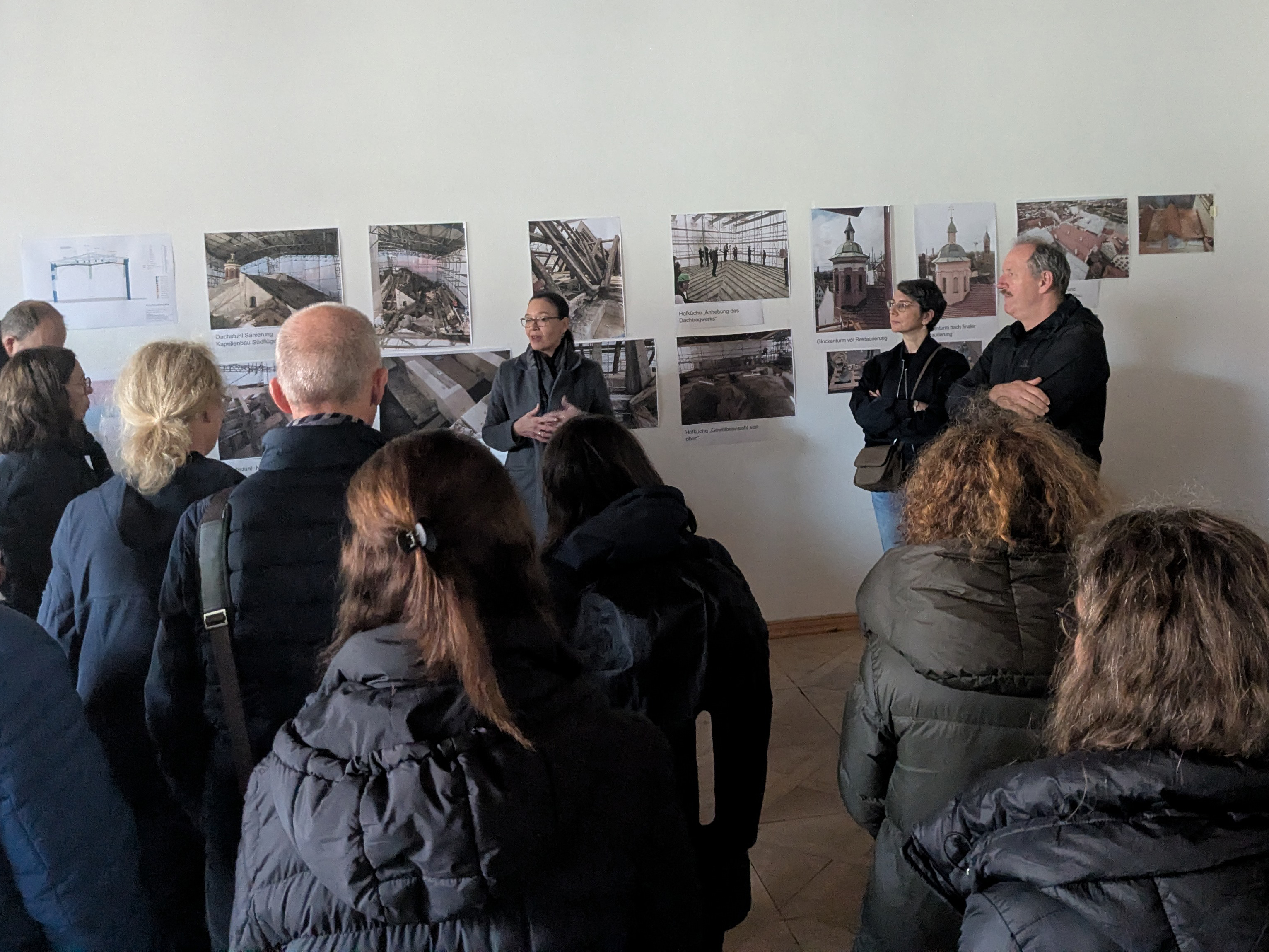 Die Gäste unter der Leitung von Leitendem Baudirektor Bernd Bayer wurden von Baudirektorin Kathy Dörr und Architekt Wilhelm Zett vom Büro Eck-Fehmi-Zett aus Landshut durch die Baustelle geführt. Dabei wurden bautechnische Besonderheiten, Herausforderungen in den Planungsabläufen und denkmalschutzrechtliche Anforderungen thematisiert.
