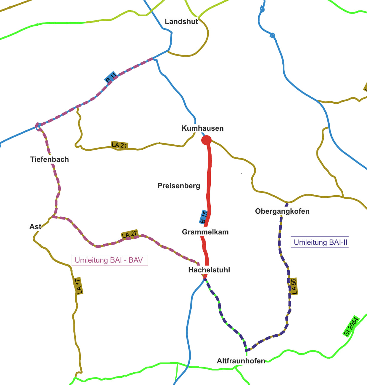 Karte: Die Umleitungsstrecke für die Sanierungsarbeiten auf der B 15 zwischen Kumhausen und Hachelstuhl.